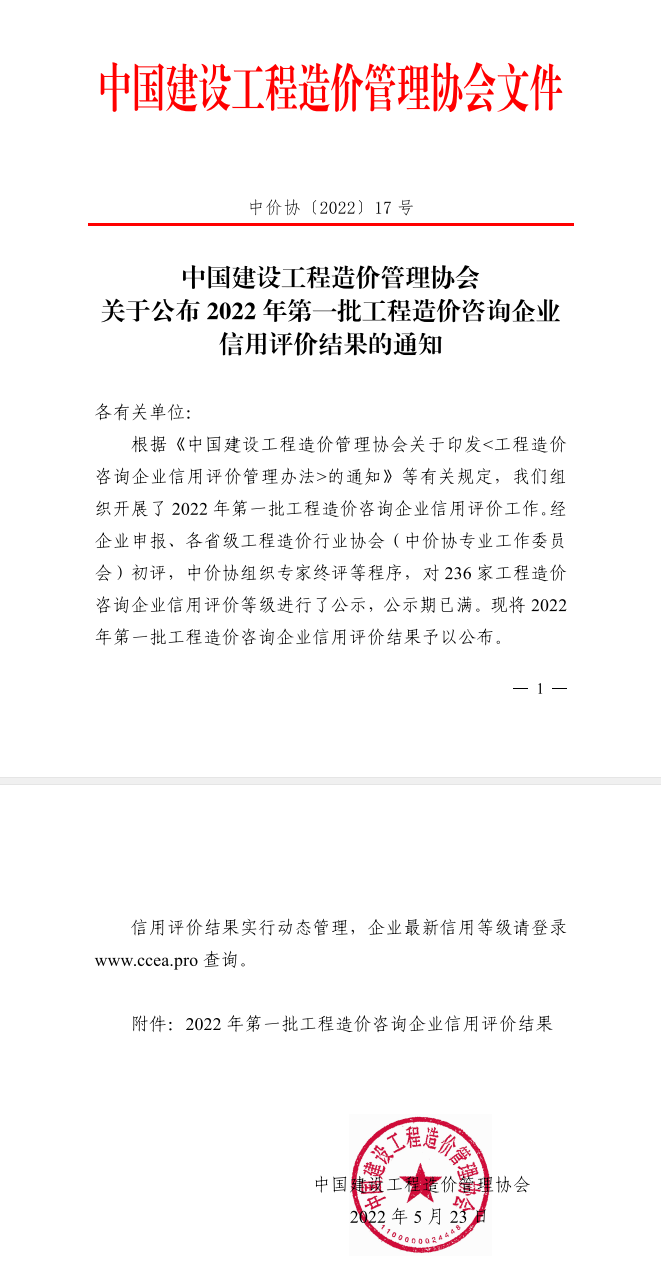 根据《中国建设工程造价管理协会关于印发<工程造价咨询企业信用评价管理办法>的通知》等有关规定,中国建设工程造价管理协会组织开展了2022年第一批工程造价咨询企业信用评价工作。经各省级工程造价行业协会(中价协专业工作委员会)初评,中价协组织专家终评等程序,最终欧亿·体育(中国)有限公司获评AAA级企业,此次评选中AAA级企业福建省仅两家。